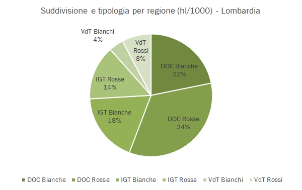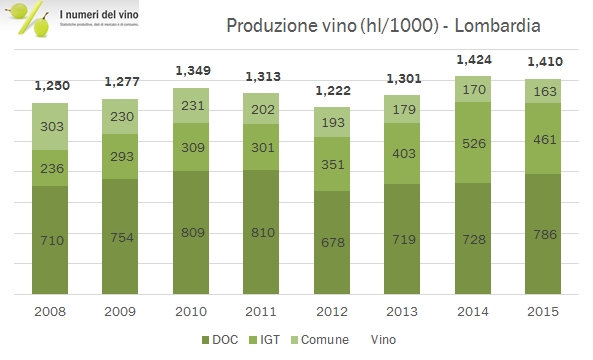 - Guardando ai dati qualitativi, i vini DOC crescono dell’8% sul 2014 e sfiorano quota 800mila ettolitri, ormai il 56% della produzione regionale. Molto elevato anche il dato dei vini IGT di 426mila ettolitri, sebbene in questo caso si confronti con un 2014 fortissimo. La produzione IGT in Lombardia è del 50% superiore alla media storica. Come accennavamo sopra, i vini comuni sono in costante calo, ormai relegati a una quota marginale (12%) della produzione regionale.
