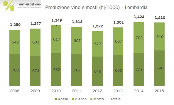 - La produzione di 1.41 milioni di ettolitri del 2015 è in leggerissimo calo rispetto al 2014 ma si innesta in un trend leggermente crescente e molto costante, con oscillazioni minime. Siamo circa il 9% sopra la produzione media regionale degli ultimi 10 anni di 1.26 milioni di ettolitri.