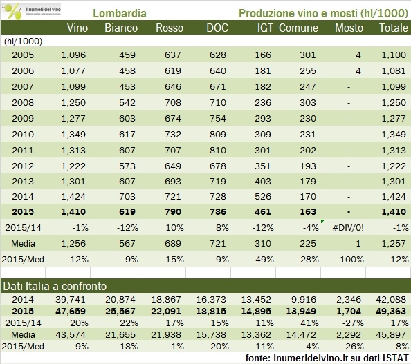 Anche nel 2015 i dati produttivi della Lombardia si discostano in modo deciso da quelli nazionali, per via di una significativa (e invidiabile) costanza dei volumi prodotti. A fronte di un balzo della produzione nazionale del 20%, la Lombardia ha fatto segnare un -1% (1.41 milioni di ettolitri), per via di un dato 2014 molto migliore della media nazionale. Infatti, se si guardano i dati in prospettiva decennale i dati lombardi e quelli nazionali sono molto più coerenti: 9% in più della media storica contro +12% per il dato italiano in generale. Nello specifico del 2015 la vendemmia è stata migliore per i vini rossi che per i bianchi, molto buona per i vini DOC rispetto ai vini comuni, che sembrano in via di estinzione nella regione. I dati provinciali mettono in luce due tendenze opposte: una forte crescita delle superfici vitate a Brescia, supportata dagli spumanti, e un trend contrario in provincia di Pavia, dove invece nel 2015 si sono persi circa 600 ettari di vigneto. Andiamo a leggere qualche dato insieme.