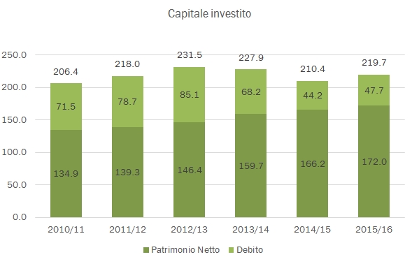 • La struttura finanziaria peggiora leggermente, a fronte di una ripresa degli investimenti (13 milioni contro soltanto 5 dello scorso anno) volta ad aumentare la capacità produttiva locale in Francia, dove l’azienda sta operando in modo più profittevole. Di conseguenza, l’indebitamento cresce leggermente da 44 a 48 milioni di euro (dopo aver anche pagato circa 4 milioni di dividendi) e il capitale investito sale da 210 a 220 milioni di euro. Con 20 milioni di utile operativo, il ritorno sul capitale si attesta a circa il 9%.
