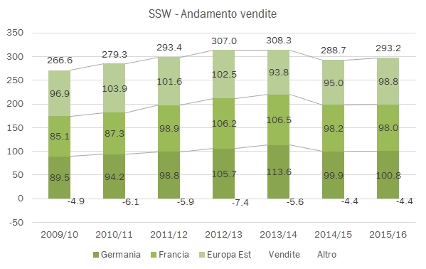 Il 2016 è stato un anno di calma piatta per Schloss-Wachenheim, l’azienda tedesca quotata in Germania e attiva nel segmento dei vini spumanti. L’andamento del prezzo in borsa è stato pressochè stabile e anche gli utili aziendali non hanno visto particolari variazioni. Cambiano però due cose: 1) il bilanciamento degli utili, dove il contributo della divisione francese e est europea è sempre di più, mentre gli utili generati nel mercato domestico sono ormai ridotti al lumicino (2.3 milioni di euro su 20 di utile operativo); 2) riprende il ciclo di investimenti dell’azienda, con un impatto leggermente negativo sullo stock di debito. Tornando alla valutazione borsistica, SSW rimane su multipli molto convenienti anche se misurati sull’anno passato; circa 6.2 volte in termini di EV/EBITDA (173milioni valore d’impresa contro 28 milioni EBITDA) e 8.5 volte in termini di EV/EBIT; il prezzo/utili invece si attesta attualmente a circa 12 volte. Ma passiamo a guardare i dati 2015/16 insieme.
