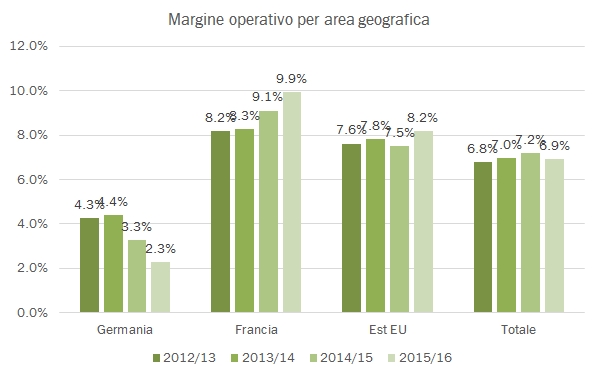 • In Francia le cose vanno decisamente meglio, con un fatturato stabile di 98 milioni di euro (su bottiglie calate a 68 milioni), ma con un margine in crescita che tocca il 9.7%. Lo stesso discorso vale per l’Est Europa che apporta un fatturato di 99 milioni di euro e un utile operativo pari a 8 milioni, quindi con un margine dell’8%, anch’esso in buona progressione nel corso degli ultimi anni.