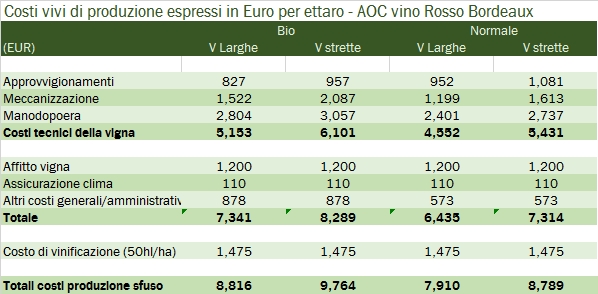 - Segue un costo di vinificazione calcolato per ettaro in base a una produzione di 50hl/ha di 1475 euro, che significa 30 centesimi di euro al litro.