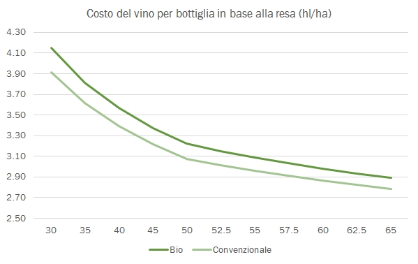 - Lo studio stima un investimento in macchinari necessario per l’attività agricola di circa 159mila euro per la viticoltura bio e di 128mila per quella convenzionale, a significare che nonostante sia bio ci vogliono più macchine che per la coltura convenzionale. Gli investimenti sono ricompresi nei calcoli del costo in termini di ammortamento delle macchine e oneri finanziari dell’investimento.