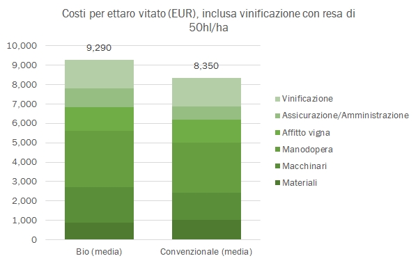 - Seguono i costi indiretti, cioè affitto della vigna (1200 euro per ettaro), l’assicurazione (110) e i costi amministrativi, che sono superiori per la viticoltura bio, presumibilmente per le certificazioni. Si arriva così a costi totali prima di vinificare di 7300-8300 euro per il bio e 6400-7300 per la viticoltura convenzionale per ettaro, quindi circa 900-1000 euro di differenza.