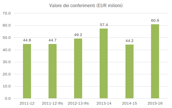 - La profittabilità della cooperativa è largamente determinata dal consolidamento di Nosio, e cala dunque dal 4.3% al 3.8%, per un utile operativo di 6 milioni di euro. Come si addice a una cooperativa, l’utile netto è sostanzialmente in pareggio. Dal punto di vista dei conferimenti e delle liquidazioni ai soci, i dati disponibili sono molto poveri, ve li mostro nei due grafici che seguono sotto. I conferimenti dell’annata sono in crescita del 10% circa (non danno più numeri precisi ma solo approssimati… mah…) mentre le liquidazioni ai soci di 61 milioni sono molto superiori ai 44 milioni dell’anno precedente ma vanno forse meglio confrontati con quelli del 2014 di 57 milioni di euro. In questo caso penso che gli 11 mesi di durata dell’anno abbiano avuto un impatto piuttosto limitato.