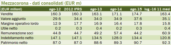 - Passando brevemente alla parte finanziaria, la cooperativa ha tagliato ulteriormente gli investimenti da 6.4 a 3.8 milioni di euro, ben sotto il livello degli ammortamenti di circa 10 milioni di euro. Approfittando di questo “spazio” di circa 6 milioni di euro e dell’andamento positivo del capitale circolante (calato di 3 milioni di euro), il bilancio si chiude con un debito netto di 121 milioni di euro, ben 13 milioni sotto i 134 milioni del 2015.