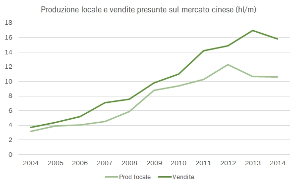 - La produzione locale di vino secondo lo studio ha toccato 10.6 milioni di ettolitri, triplicando nel decennio se confrontata con il livello di 3.2 milioni di ettolitri del 2004. La resa produttiva ha avuto un forte incremento tra il 2009 e il 2012 da 80 a 140 ettolitri per ettaro, per riscendere a poco meno di 90 nel 2014.