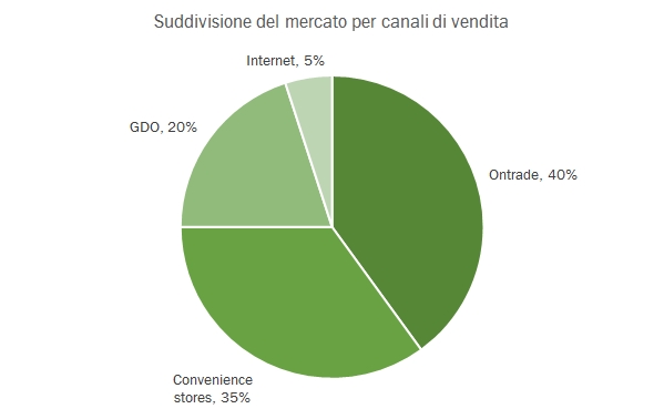 - Il mercato e i consumi di vino sono difficili da leggere, ma dalle torte potete notare alcuni temi interessanti. Primo, il forte peso della componente “ontrade”, che corrisponde a Ho.Re.Ca. rispetto alla grande distribuzione, solo al 20%. Secondo, interessante notare come l’ecommerce è già una componente molto rilevante in questo mercato.