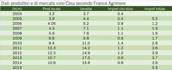France Agrimere ha fatto un buon lavoro di raccolta di una serie di dati sul mercato e produzione di vino in Cina, che da sempre rappresentano un punto di domanda per la maggior parte degli operatori. In verità neanche questi dati riescono a essere del tutto convincenti, ma cominciano a fornirci qualche tendenza di massima e qualche informazione in più sulla produzione di vino che nel 2014 si svolgeva su 121400 ettari con una resa di circa 88-89 ettolitri a ettaro per una produzione di vino locale cinese di poco inferiore a 11 milioni di ettolitri. Non è stato il record, toccato invece nel 2012 quando la produzione ha superato i 12 milioni di ettolitri. Le torte allegate vi danno anche ragione del tipo di produzione, soprattutto vitigni internazionali (Cabernet Sauvignon in testa) e soprattutto rossi (90%). Passare dalla produzione al consumo non è semplice, anche se non essendoci a quanto sembra scorte e essendo l’export molto limitato, si bevono quello che producono più quello che importano… cioè tra il 2013 e il 2014 qualcosa tra 16 e 17 milioni di ettolitri. Essendo 1.3 miliardi di persone, ancora un prodotto di nicchia nel paese… andiamo a leggere qualche dato insieme.