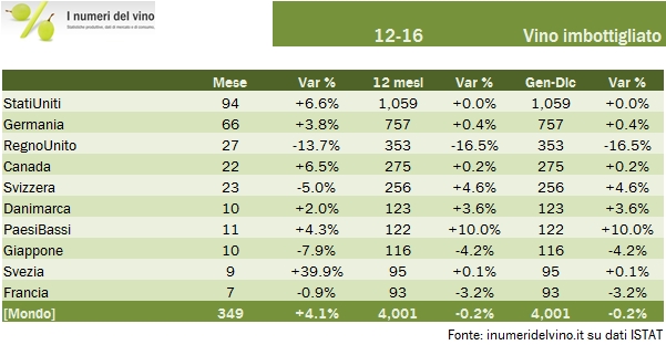 Il 2016 chiude con un secondo colpo di coda dei vini fermi e porta le esportazioni italiane al loro massimo storico di 5582 milioni di euro, per una crescita del 4.4% sullo scorso anno. Il mese si caratterizza per due cose: un calo marginale ma comunque “nuovo” dei vini spumanti dell’1% (in un mese peraltro non critico), non accadeva da ottobre 2015, con un secco -21% del Regno Unito nel solo mese di dicembre. Secondo: una ripresa molto visibile delle esportazioni di vini sfusi, che da agosto a questa parte hanno dato segnali di risveglio (come hanno anche ripreso vigore le esportazioni di vino fermo). Terzo: un temporaneo stop alla crescita delle esportazioni in Cina, dopo molti mesi positivi, che fa restare il paese sotto la soglia di 100 milioni di euro, a meno di ricomprendere anche le categorie minori rispetto a quelle che normalmente includiamo (cioè imbottigliati, sfusi e spumanti). Le conclusioni già fatte nei mesi precedenti non cambiano nella sostanza: è stato un anno molto positivo per l’Italia e la crescita delle esportazioni di oltre il 4% non è secondo quasi a nessuno (alla Nuova Zelanda si…). Però, dalle considerazioni di sopra il 2017 si apre con qualche punto di domanda sulla sostenibilità di tale andamento, molto legata agli spumanti e, all’interno della categoria, ad alcuni spumanti. Passiamo ai dati.