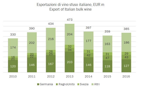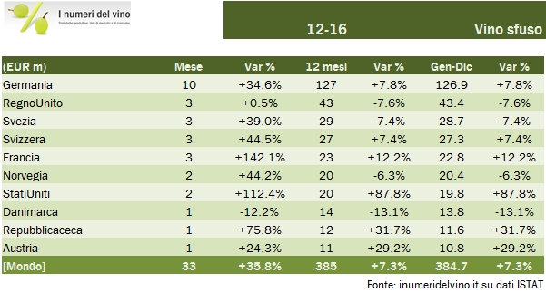 • Neil segmento degli sfusi abbiamo assistito a un boom finale d’anno. Nel 2016 abbiamo esportato 5.5 milioni di ettolitri, +9%, per 385 milioni, +3%. E’ tornata a crescere la Germania, +8% a 127 milioni di euro, ma anche Svizzera e Francia a 27 e 23 milioni cominciano a diventare importanti. Probabilmente si tratta di una tendenza destinata a crescere vista l’ottima produzione delle ultime due vendemmie.