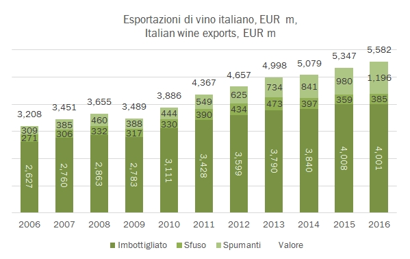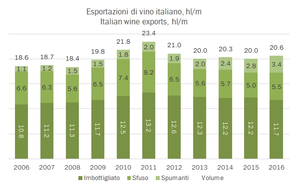 • I dati di chiusura del 2016 sono 4001 milioni di vini imbottigliati, stabili (ma in ripresa negli ultimi mesi), 385 milioni di vini sfusi, +7% e 1196 milioni per i vini spumanti, +22%. Per queste ultime due categorie, un andamento opposto in dicembre rispetto a quanto visto in precedenza, calo per gli spumanti, crescita forte per i vini sfusi. Ne esce un quadro globale di una crescita del 4.4%, con un incremento dei volumi del 2.9% a 20.6 milioni di ettolitri.