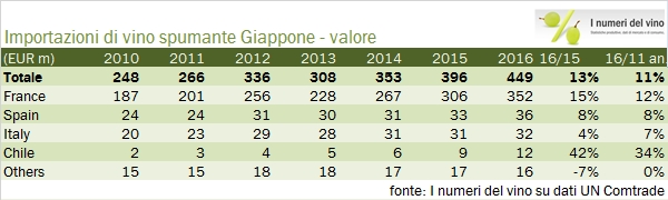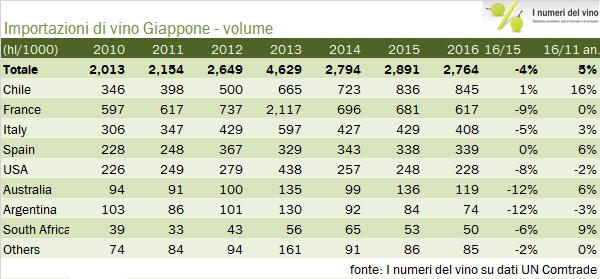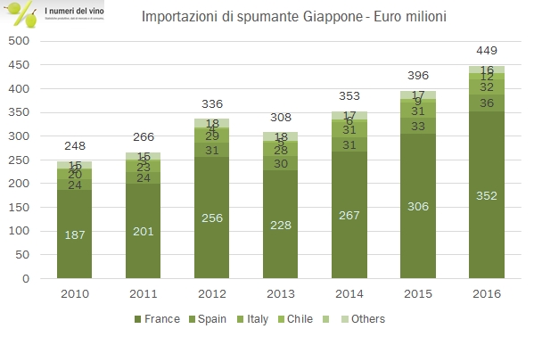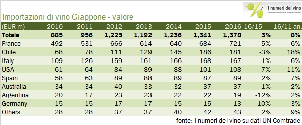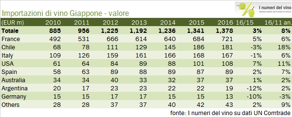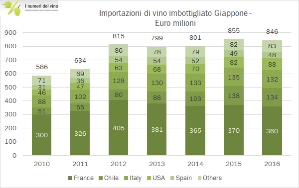 Le importazioni di vino in Giappone sono cresciute leggermente nel 2016, ma soltanto se si guardano i numeri in euro, perché il rafforzamento dello yen ha consentito ai giapponesi di spendere l’8% in meno (165 miliardi di yen o circa 1.4 miliardi di euro) per acquistare 2.8 milioni di ettolitri di vino, il 4% in meno dello scorso anno. Il paradosso di questi dati per noi italiani è che l’unica categoria in forte crescita nel mercato nipponico sono gli spumanti (+13% in euro e +3% in Yen), che sono anche l’unica categoria in forte crescita in generale per il nostro export. Purtroppo nonostante le due ottime premesse i nostri spumanti sono quasi fermi e questo influenza la performance delle nostre esportazioni: in breve siamo relegati al terzo posto dietro la dominante Francia (52% del mercato e in crescita del 5%) e al Cile, anch’esso peraltro in leggero calo. Continua la progressione dei prodotti americani mentre nonostante la prossimità geografica i vini australiani continuano a non riscuotere un grande successo. Passiamo all’analisi dei dati.