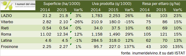 - I dati sulle superfici mostrano un incremento di 600 ettari della superficie vitata da 21200 a 21800 ettari. L’incremento è tutto in provincia di Roma, passata da 11mila a 12300 ettari… sono da ricontrollare.