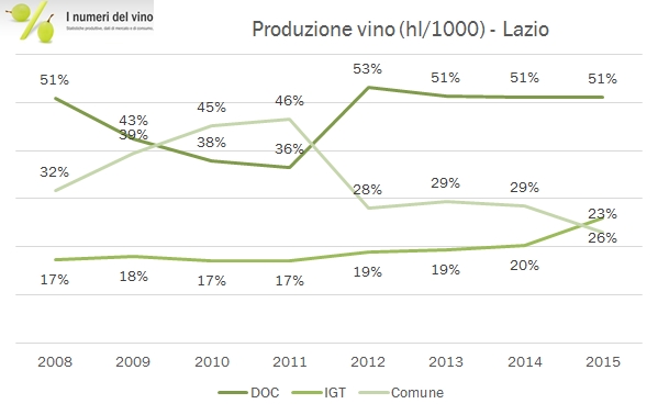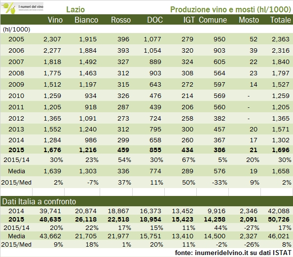 I dati che commentiamo oggi sulla produzione di vino laziale sono particolarmente positivi e si innestano su un trend incoraggiante già cominciato qualche anno fa. La vendemmia 2015 si è chiusa in rialzo del 30% e in linea con la media storica, quindi meglio della media italiana sul confronto con l’anno scorso e un po’ peggio rispetto ai dati storici (+9% Italia +2% Lazio). Resta però elevata la quota di prodotto DOC (nonostante la vendemmia ricca tenda a premiare più i vini comuni) e nel 2015 i vini comuni hanno perso ulteriore quota a vantaggio dei vini IGT, mentre i vini di qualità restano sopra il 50% della produzione regionale, un dato chiaramente superiore a quello italiano (40%). Le previsioni vendemmiali ISMEA per il 2016 sono molto buone, con una produzione prevista di 1.7 milioni di ettolitri, +2% rispetto al 2015 nel contesto di una produzione attesa in leggero calo a livello nazionale. Passiamo a commentare i dati.