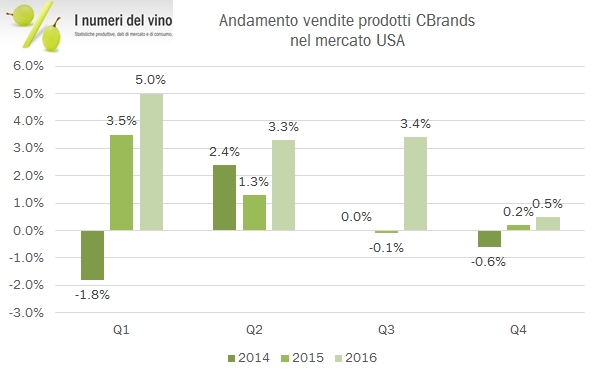 • Le vendite sono cresciute a 7.3 miliardi di dollari, +12%, con 4.2 miliardi di vendite di birra (+17%), 2.7 miliardi di dollari d vendite di vino (+6%) e 363 milioni di dollari di vendite di spirits (+9%). Nell’ultimo trimestre dell’anno, l’impatto della vendita del business canadese si comincia a vedere sul segmento vino, che segna un calo del 3.5% a 637 milioni di euro. Se si considerano i dati di “sell-out” cioè gli acquisti dei clienti, le vendite in USA di CBrands sono in crescita del 2.9% nell’anno e dello 0.5% nell’ultimo trimestre.