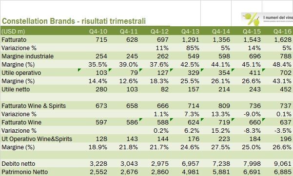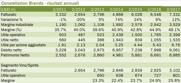 Gli ultimi tre mesi del 2016/17 per Constellation Brands sono stati molto soddisfacenti, tanto da fargli superare del 2% circa le indicazioni di utile per azione 2017. E sulla medesima lunghezza d’onda sono le indicazioni per quest’anno: il management si attende un utile per azione tra 7.7 e 8 dollari per azione, il che significa tra il 14% e il 18% in più dell’anno appena concluso e un livello al di sopra dell’indicazione di medio termine di una crescita annua del 10%. Sulla base dei dati 2016 e di queste indicazioni le azioni di CBrands sono salite di circa 10 dollari a 170 dollari, riguadagnando il livello di ottobre 2016, prima delle scioccanti dichiarazioni di Trump sul Messico (dove CB produce la birra) e sui potenziali dazi sui prodotti importati. Tornando ai numeri del 2016, le cifre vanno lette considerando le operazioni straordinarie compiute nel segmento del vino, con la vendita del business canadese e le acquisizioni in USA. Il segmento vino/spirits ha chiuso il 2016 con vendite in crescita del 6% (ma in leggero calo per la vendita del Canada nell’ultimo trimestre) e con margini record, saliti al 25.8%. Ritmi ben diversi quelli della birra, dove la crescita delle vendite supera il 16% e il margine viaggia intorno al 32%. Passiamo all’analisi dei dati.