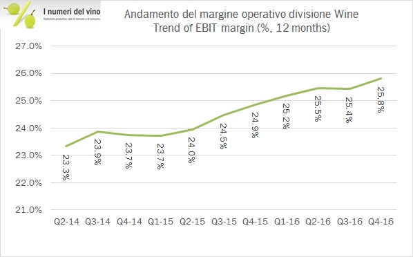 • I margini sono in crescita in entrambe le divisioni. Nel segmento vino e spirits i margini sono tornati a crescere anche per via della vendita della divisione canadese. Nell’anno Cbrands realizza un utile operativo consolidato di 2.4 miliardi di euro, che include 2.14 miliardi escludendo il capital gain sulla vendita del business in Canada. Di questo il vino chiude a 0.8 miliardi di dollari, +10% e un margine del 25.8% come dicevamo, il più elevato da quando viene riportato. A differenza delle vendite, l’utile operativo invece cresce nel trimestre, +6% a 196 milioni di dollari.