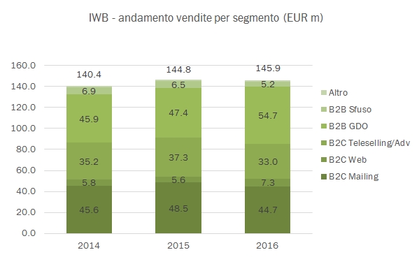 - La divisione internet di IWB riprende velocità nel segmento B2C chiudendo a +31% e 7.3 milioni di euro con un secondo semestre a +43%. Tali vendite però, come anche quelle al B2C mailing e tele-selling all’estero, hanno determinato un impatto negativo sui margini che il gruppo ha calcolato in 3 milioni di euro (209mila ordini).