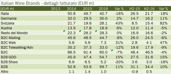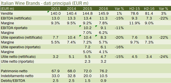 La metamorfosi di Italian Wine Brands è continuata nel secondo semestre del 2016 e ha portato a una chiusura d’anno con utili in calo del 15% circa. All’interno di questo trend negativo, caratterizzato dalla debolezza del B2C (ex Giordano) e dell’attività italiana, ci sono anche dei segnali positivi, come la ripartenza delle vendite via internet (+47% dopo il +15% del primo semestre) e il forte sviluppo nel mercato svizzero (+82% nel secondo semestre). La struttura finanziaria di Italian Wine Brands migliora in modo sensibile, con un debito calato a 10 milioni di euro (da 20 milioni), derivante da un forte miglioramento del capitale circolante e dal forte contenimento degli investimenti, entrambi fattori potenzialmente non sostenibili nel futuro. Le previsioni sul 2017 sono improntate sul recupero dei margini: lo sforzo di internazionalizzazione e di spostamento verso internet non è venuto gratis, ma ha prodotto a delle perdite, che il management ritiene di poter recuperare nel 2017, riportando l’EBITDA margin (7.8% nel 2016) al livello del 2014/15 (oltre il 9%). Passiamo all’analisi dei numeri.