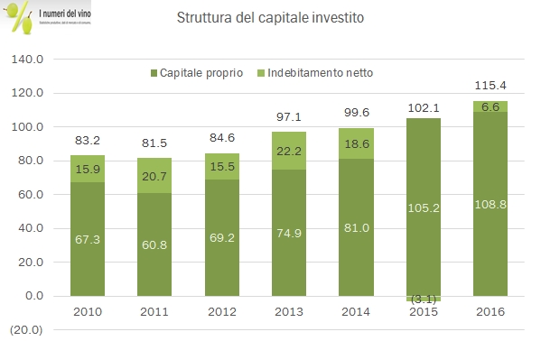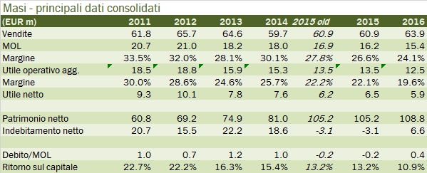 • Dal punto di vista finanziario, Masi passa da 3 milioni di euro di cassa a 6.6 milioni di euro di debito, quindi con un assorbimento di 10 milioni di euro, così composto: 12 milioni di euro di generazione di cassa dell’attività (rispetto a 11 del 2015), un assorbimento di 6 milioni di euro di capitale circolante, investimenti per 6.5 milioni, l’acquisizione di Canevel per 7 milioni di euro e un 3 milioni di euro per il pagamento del dividendo dell’anno scorso. La struttura finanziaria si mantiene molto forte, con un indebitamento di circa 0.4 volte il MOL.