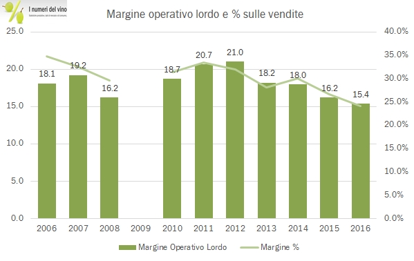 • A livello operativo ci sono state diversi fattori che hanno influenzato l’attività. Il calo dei contributi OCM (per oltre 1 milione di euro), l’aumento dei prodotti imbottigliati nel magazzino, con conseguente impatto positivo sul margine industriale (stimiamo 0.5-1 milione di euro) e il cambio dei principi contabili (circa 0.7 milioni di impatto negativo, però già calcolato anche per i dati riclassificati relativi al 2015). Tutto dentro il margine operativo lordo cala del 5% a 15.4 milioni di euro e l’utile operativo dichiarato del 7% a 10.1 milioni di euro. Se risommiamo l’ammortamento dell’avviamento arriviamo a 12.5 milioni di euro, -7%. L’utile netto dichiarato passa da 6.5 a 5.9 milioni di euro, -9%. L’azienda ha mantenuto il dividendo invariato a 9 centesimi per azione, che corrisponde a circa metà dell’utile e che dovrebbe garantire agli azionisti un ritorno del 2% rispetto al valore delle azioni.