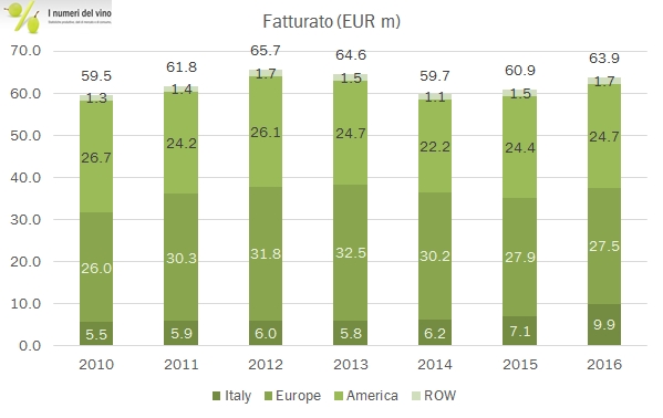 • Da un punto di vista geografico i dati annuali mostrano un forte progresso dell’Italia, a +40% per 10 milioni di euro (probabilmente circa +25% senza contare Canevel) e un livello stabile sia in Europa (27 milioni, -1%) che in America (25 milioni, +1%). Nel resto del mondo le vendite sono invece in crescita dell’11% ma restano marginali (meno di 2 milioni di euro). Se stringiamo il confronto al secondo semestre dell’anno il quadro cambia leggermente: le vendite in Europa sono in calo del 6% sul secondo semestre 2015, mentre in America la riduzione è del 4%, con qualche segnale preoccupante nei paesi scandinavi per la concorrenza di altri prodotti e una forte pressione promozionale in Canada per mantenere le quote di mercato.