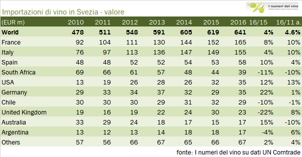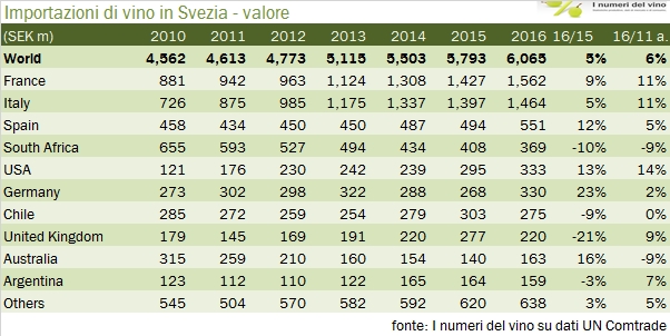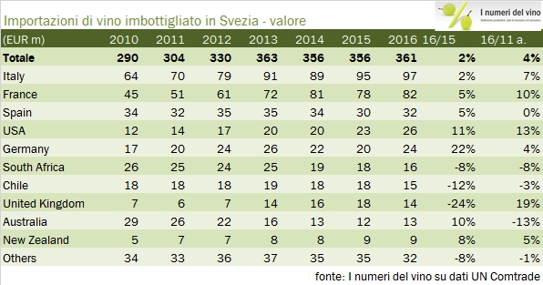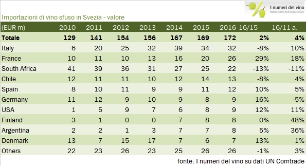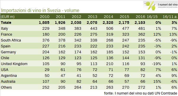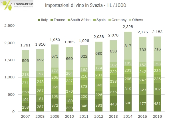 Per qualche strana ragione, mi sono perso per strada il mercato svedese e quindi recupero in questo venerdì semi-vacanziero con l’analisi delle importazioni di vino, che corrisponde anche all’analisi del mercato, dato che di produzione locale non ce n’è. Come succede anche in Danimarca e Norvegia, i leader indiscussi qui sono italiani e francesi, che sono quelli in crescita più significativa negli ultimi anni. Noi siamo davanti in Danimarca e Norvegia, i francesi sono più forti in Svezia. Il mercato svedese è molto appetibile e questa è la conclusione principale del post: la crescita è stata costante negli ultimi anni intorno al 4-5% e si tratta di un mercato piuttosto significativo, con 641 milioni e 2.2 milioni di ettolitri di prodotti importati. E’ anche un mercato con un importante peso di prodotti sfusi, circa 1 milione di ettolitri e 172 milioni di euro, dominato dai sudafricani e dagli italiani (rispettivamente per volume e valore). Anche in questo mercato, come in molti altri, i nostri spumanti stanno crescendo velocemente… passiamo ai dati.
