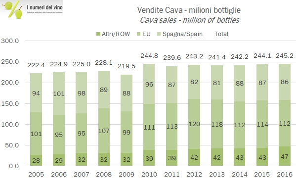 - Le vendite 2016 di Cava sono cresciute marginalmente, +0.4% a 245.2 milioni di bottiglie, con una parte molto preponderante (88% o 216 milioni di bottiglie) relativa al prodotto “base” invecchiato 9 mesi e il 12% circa di prodotti riserva e gran riserva.