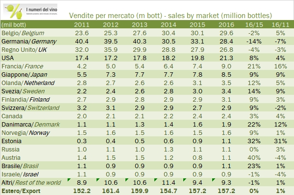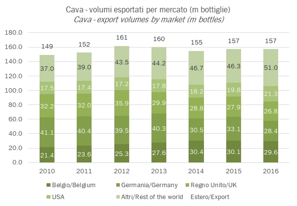 Il Cava continua a cercare sbocchi al di fuori dei mercati tradizionali. E’ questa, sostanzialmente la conclusione che si trae dai numeri 2016, pubblicati puntualmente dal DoCava, il consorzio che si occupa di raccogliere i dati dalla DOC. I volumi commercializzati sono stabili intorno a 245 milioni di bottiglie, ma la quota del mercato domestico scende al minimo storico del 35% e anche le vendite europee, che avevano raggiunto una specie di picco intorno al 50% delle vendite nel 2012 stanno perdendo leggermente quota, causa il forte regresso nel mercato tedesco non completamente compensato dal progresso in alcuni mercati quali la Scandinavia. Quindi, a tenere in piedi le vendite c’è il resto del mondo, che per questa denominazione si chiama principalmente USA. Passiamo a una breve analisi dei dati.