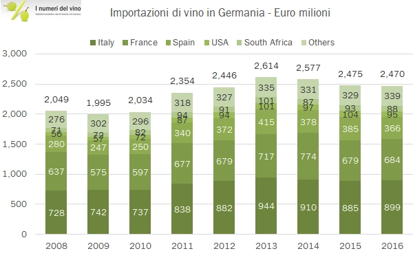 • La Germania ha importato vino per 2.47 miliardi di euro nel 2016, stabile rispetto allo scorso anno. L’import di vini in bottiglia è leggermente calato, -3% a 1.58 miliardi di euro, mentre sono praticamente stabili quelle di vino sfuso, 488 milioni di euro. Il saldo è dunque un incremento del 7% delle importazioni di vini spumanti, che passano da 369 a 395 milioni di euro, caratterizzato dalla crescita dei prodotti francesi e italiani e da un arretramento di quelli spagnoli.