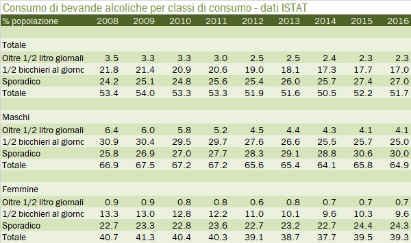 - Come ben sappiamo, il consumo abituale è strutturalmente in calo, soprattutto per il vino: siamo per la prima volta sotto il 20%, rispetto al 25% del 2008. Il consumo abituale non migliora peraltro per le altre categorie, talchè solo il 21.4% della popolazione (25% nel 2008) consuma abitualmente alcolici.