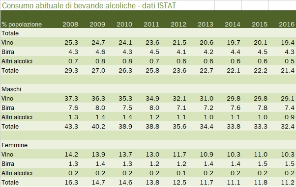 E’ il momento di aggiornare le nostre tabelle sul consumo di vino e di alcolici in Italia, che ISTAT pubblica annualmente, esprimendo non le quantità ma bensì la penetrazione del consumo (cioè quanti rispetto alla popolazione), tagliando i dati per tipo di bevanda, zona di consumo e intensità del consumo (in realtà il rapporto è più orientato a monitorare l’eccesso di consumo, anche se poi i dati sono molto completi). Il momento non è dei migliori per il vino, a leggere i dati che noi mettiamo in prospettiva temporale, cioè confrontandoli con quelli degli anni passati. La penetrazione del consumo di vino cala seppur di poco al 51.7% della popolazione, ma lo fa in un contesto di crescita della penetrazione del consumo di alcolici (64.7%) dove si avvantaggiano la birra (47.8%) e le altre bevande alcoliche (43.2%). E questo è a sua volta frutto della tendenza sempre maggiore di consumare alcolici in modo sporadico e soprattutto fuori pasto. Non solo. I dati confrontati al passato mettono in luce che per la prima volta dopo anni non cresce nemmeno la percentuale della popolazione che consuma vino ogni tanto, fino allo scorso anno in costante crescita, mentre continua il calo strutturale del “bicchiere di vino a pasto”. Passiamo dunque a guardare qualche dato insieme, lasciando al prossimo articolo l’analisi più approfondita delle tendenze regionali e per classi di età.