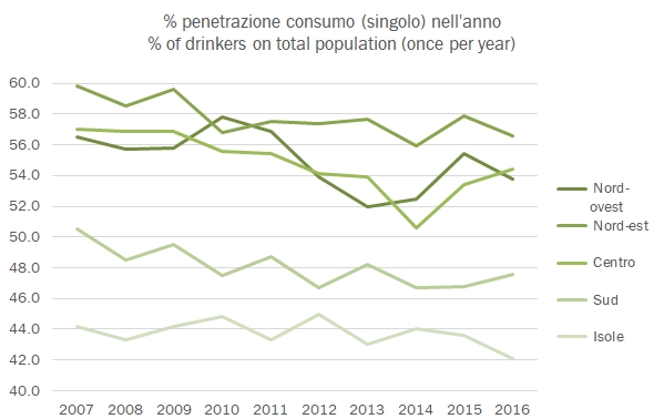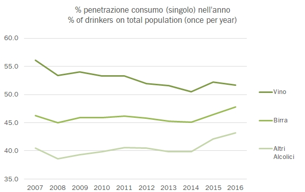 - Coloro che consumano vino in Italia sono il 51.7% della popolazione sopra gli 11 anni, in calo rispetto al 52.2% dello scorso anno, dato peraltro in crescita evidente rispetto al minimo storico del 2014. Sono invece in crescita i bevitori di birra, 47.8% rispetto al 46.4% del 2015, il livello massimo da quando analizziamo questo rapporto. Lo stesso vale anche per le altre bevande alcoliche, salite al 43.2% dal 42.1%, a suggellare una penetrazione totale delle bevande alcoliche vicinissima al 65% della popolazione sopra gli 11 anni di età.