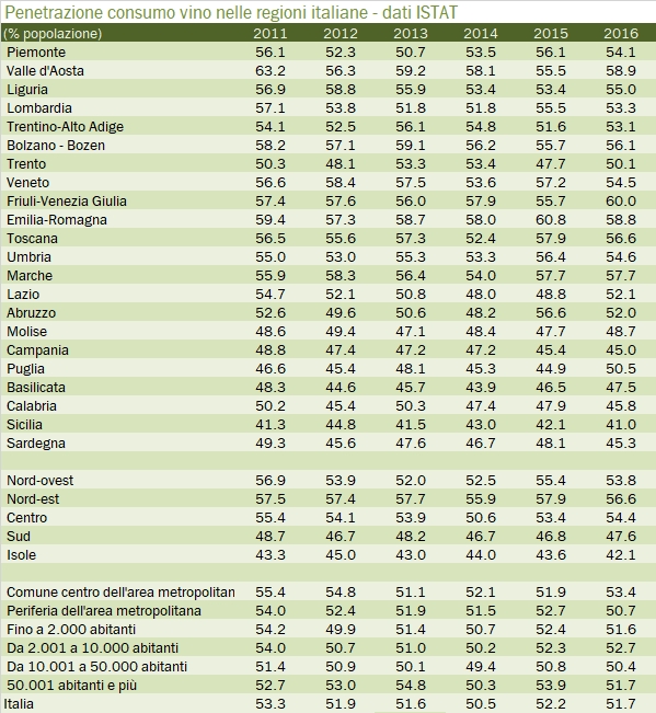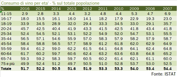 - Da un punto di vista anagrafico, la penetrazione del consumo di vino raggiunge il picco a cavallo dei 45-64 anni. Nella rilevazione del 2016 è la fascia 60-64 anni quella con il valore più elevato, 61.7%, mentre storicamente è quasi sempre stata la fascia precedente 55-59 anni ad avere i dati più elevati.