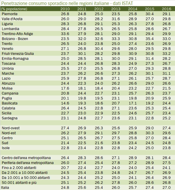 - Passando ai dati regionali, i dati sono piuttosto volatili. Nel 2016 come anticipavamo leggiamo dati molto positivi per regioni come la Puglia, che torna sopra il 50% in termini di penetrazione di consumo, come pure lo stesso succede per il Lazio. Le regioni dove sembra esserci un trend di crescita dei consumi nel corso degli anni sono certamente la provincia di Bolzano, il Friuli Venezia Giulia, unica regione dove la penetrazione del consumo tocca il 60%, tra l’altro con una delle più basse incidenze di forti bevitori e una delle maggiori quote di bevitori sporadici (il 33% circa). Seppure su valori un più bassi vanno notati i trend stabili di regioni come Lombardia, Abruzzo ma anche Sicilia.