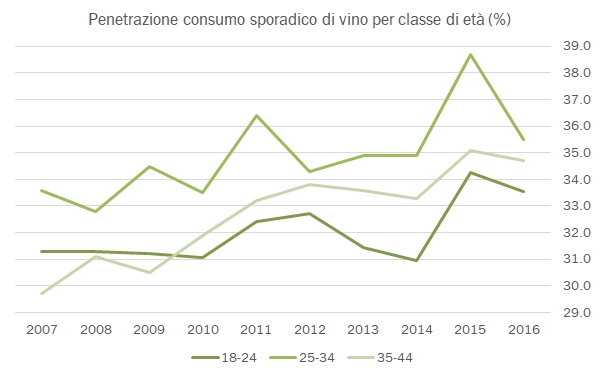 - Il consumo sporadico di vino vede invece il suo picco di penetrazione tra i giovani, tra 25 e 34 anni, con dei dati piuttosto coerenti con le evidenze storiche intorno al 35%, mentre sono circa il 10-11% i giovani di 16-17 anni che ogni tanto bevono vino.