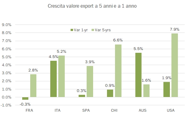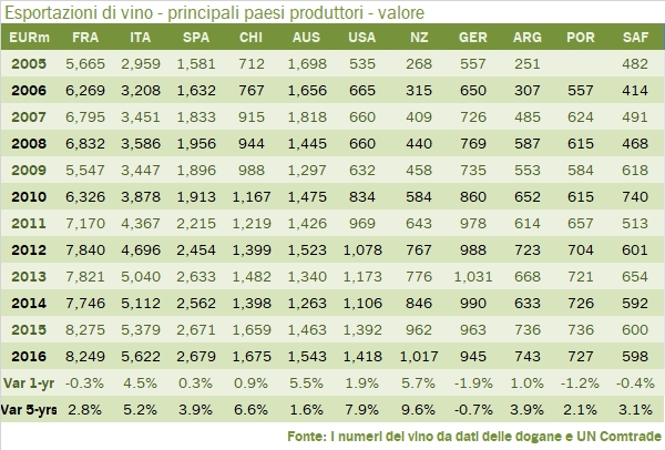• Il 2016 è stato dunque l’anno di Australia e Nuova Zelanda. Se la seconda con il +5.7% non è una sorpresa (+10% annuo sugli ultimi 5 anni…), l’Australia sta recuperando un po’ di terreno con la stabilizzazione del cambio. Con 1.54 miliardi di euro di vino esportato resta la quinta forza mondiale del vino, dopo Francia, Italia, Spagna e Cile, precedendo gli USA che sono cresciuti soltanto del 2% a 1.46 miliardi di euro, dopo il balzo del 2015 legato alla rivalutazione della valuta.