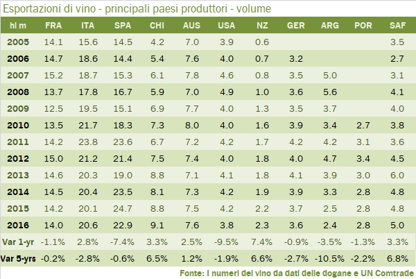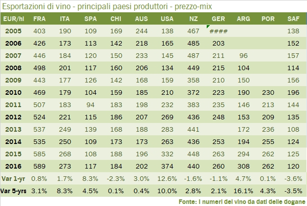 • Le esportazioni 2016 dei primi 11 paesi (Italia, Francia, Spagna, Cile, Australia, Nuova Zelanda, USA, Argentina, Sud Africa, Portogallo e Germania) sono leggermente cresciute in euro a 25.2 miliardi, +1.5%, con un andamento leggermente calante per i volumi, -1.3% a 94 milioni di ettolitri e un incremento del 2.8% del prezzo medio di esportazione, +2.8%.