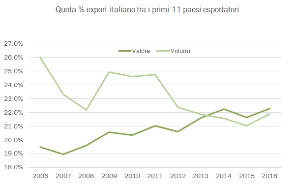 • L’andamento italiano come dicevamo è rassicurante: il 22.3% delle esportazioni di questi paesi è nostro, secondi solo alla Francia che rappresenta il 33%, ma la cui quota è strutturalmente calante da diversi anni a questa parte.