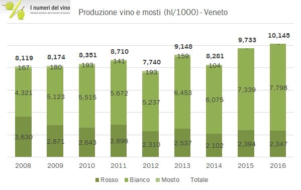 - I 10.14 milioni di ettolitri dichiarati da ISTAT per il Veneto sono l’ultimo punto di una crescita produttiva molto costante nel tempo, pur con qualche buco, di circa 200-250mila ettolitri all’anno, concentrata nel segmento dei vini bianchi e dei vini DOC, in progressione di circa 350mila ettolitri all’anno e di un calo strutturare nel segmento dei vini rossi di circa 100-120mila ettolitri all’anno.