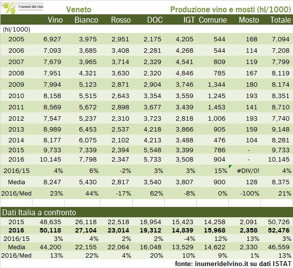 La produzione di vino in Veneto tocca per la prima volta quota 10 milioni di ettolitri, con un incremento del 4% rispetto al 2015 che si origina nel segmento dei vini bianchi soprattutto nelle categorie IGT e Vini da Tavola, mentre i vini DOC crescono leggermente di meno. La vendemmia in Veneto è peraltro paragonabile ai dati italiani che abbiamo attualmente a disposizione, che vedono un incremento del 3% della produzione di vino a 50.1 milioni di ettolitri. Il Veneto dunque rappresenta il 19% della produzione nazionale, ma molto di più dei vini bianchi (27%) e ancora di più dei vini bianchi DOC, che sono il 45% della produzione italiana (4.8 milioni di ettolitri rispetto a 10.6 totali). Passiamo ad analizzare i dati dettagliati.