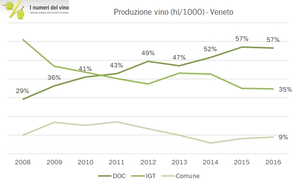 - Come dicevamo sopra, sono i vini bianchi a guidare la crescita, anche se nel 2016 sono stati i vini bianchi da tavola (+22% a 756mila ettolitri) e IGT (+9% a 2.2 milioni di ettolitri) a guidare la crescita, mentre i DOC (+3% a 4.8 milioni di ettolitri) sono cresciuti più in linea con il resto della produzione.