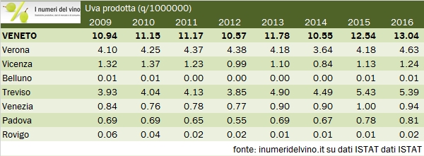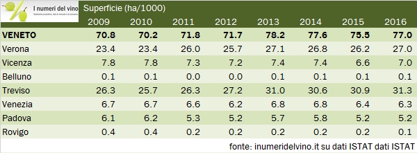 - I dati provinciali mettono in luce il balzo delle superfici vitate e della produzione della provincia di Treviso (31300 ettari rispetto a 26mila di 5 anni fa), dove il Prosecco è più diffuso. E’ lì che si concentrano la maggior parte degli ettari vitati aggiunti nella regione, oltre che nella provincia di Verona, che ha comunque aggiunto qualche ettaro nel corso degli anni raggiungendo quota 27mila.