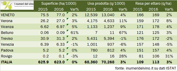 - Le rese vinicole sono vicine ai massimi storici, con 169 quintali per ettaro nel 2016, +2%, nell’ambito di un incremento del 3% a livello italiano.