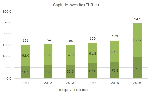 Anche se i numeri sembrano particolarmente buoni a prima vista, il 2016 di Advini è stato molto aiutato un significativo provento straordinario che di fatto spiega per intero la progressione del margine e degli utili, altrimenti fermi a 5 milioni di euro (e non 10 come riportato). A crescere nel 2016 è invece il debito dell’azienda, dato che continuano gli investimenti: nel 2016 sono in tutto 58 milioni di euro, un’enormità rispetto al valore dell’azienda (136 milioni di valore di mercato, qualche interesse di minoranza e 150 miloni di debito, quindi poco meno di 300 milioni in tutto). Di questi 13 sono veri e propri investimenti (il doppio degli ammortamenti a dimostrare il forte ciclo in atto) e ben 45 sono acquisizioni: Maison Champy in Borgogna (22 ettari), 250 ettari di vigneto nel Bordeaux (con l’ingresso a compensare parte della botta di Credit Agricole con il 5% del capitale), Chateau Roquefeuille in Provenza (100 ettari), Domaine Cazes nel Roussillon (200 ettari biodinamici di “Cotes”), Bonheur Wine Estate in Sud Africa (72 ettari di vigneto nello Stellenbosch) più qualche piccola cosa qua e là nel segmento dei corsi di vino e dell’ecommerce. Insomma, lo sforzo è evidente e si ribatte in modo molto chiaro sul debito, che balza appunto a 150 milioni di euro, 7 volte il MOL dichiarato ma 10 volte quello “rettificato” per le componenti non ricorrenti. Forse a 500 milioni di vendite nel 2020 ci arrivano anche, però sarà necessario cominciare a vedere un po’ di crescita organica, che continua a mancare… passiamo ai dati.
