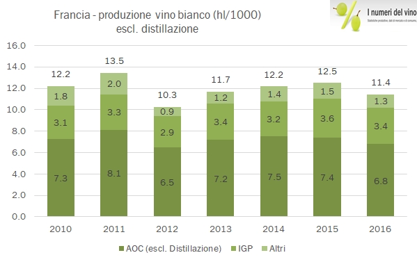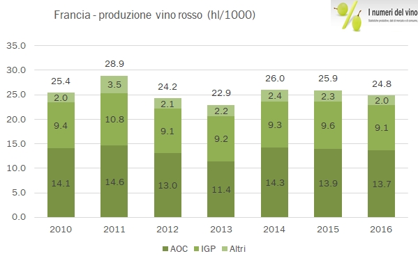 - Come dicevamo sopra, più qualità. I vini AOC sono calati soltanto del 4% e si mantengono leggermente sopra le medie storiche a 20.6 milioni di ettolitri. Diversamente da quanto capita da noi, la crescita strutturale per la Francia è nei vini rossi, calati solo del 2% nel 2015 a 13.7 milioni di ettolitri, contro il -8% dei bianchi a 6.8 milioni di ettolitri. A tal proposito le considerazioni sulla produzione a Bordeaux fatta sopra si lega molto a questi dati.