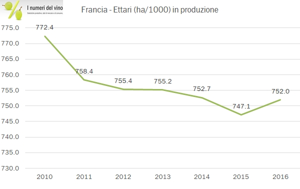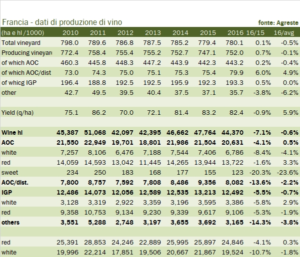- La produzione 2016 di vino in Francia ha toccato quota 44.4 milioni di ettolitri, -7% rispetto al 2015 ma non distante dalla media produttiva degli ultimi 5 anni di circa 44-45 milioni di ettolitri. Agreste sottolinea che a fronte di questo calo della produzione la resa per ettaro è diminuita soltanto dell’1% da 83 a 82 quintali per ettaro, da cui deriva che il calo produttivo si è generato più nelle decisioni di produzione che non nell’andamento agricolo.