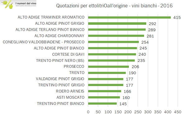 • Nel segmento dei vini bianchi svettano i vini del Trentino, con andamenti di prezzo contrastanti, mentre crescono di oltre il 10% il Conegliano Valdobbiadene (+14%), che mantiene un premio del 20% circa rispetto al Prosecco (+16%), il Cortese di Gavi (+13%), il Friuliano in ripresa (+23%), la base per il Marsala (+17%, al massimo storico) e, in un vero e proprio boom, il Roero Arneis (+45%).